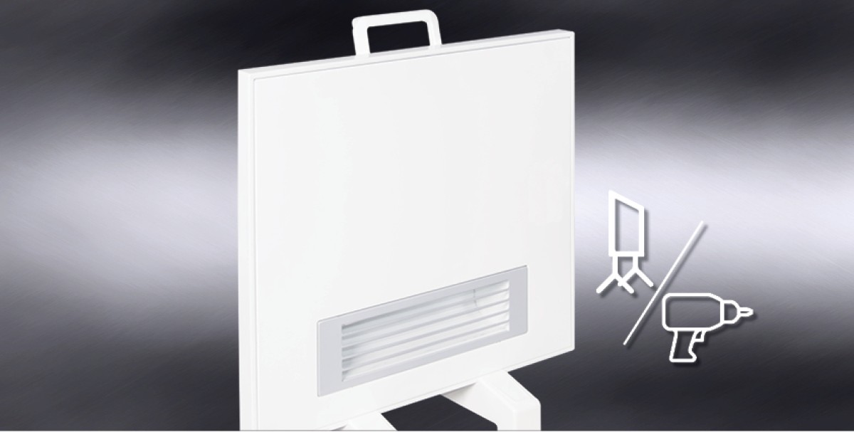İdeal boyutları, tutamaç ve sabit ayaklarıyla kolayca taşınır, istenilen her mekanda güvenle kullanılır. Opsiyonel olarak temin edilebilen montaj kitiyle duvara da sabitlenebilir.